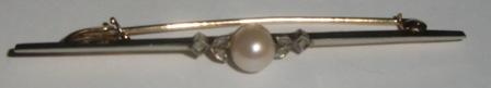 M567M 1960s David Andersen long Brooch 14K gold, culture pearl 5,6 mm and 6 small rose cut diamonds, weight 2,6 gram.