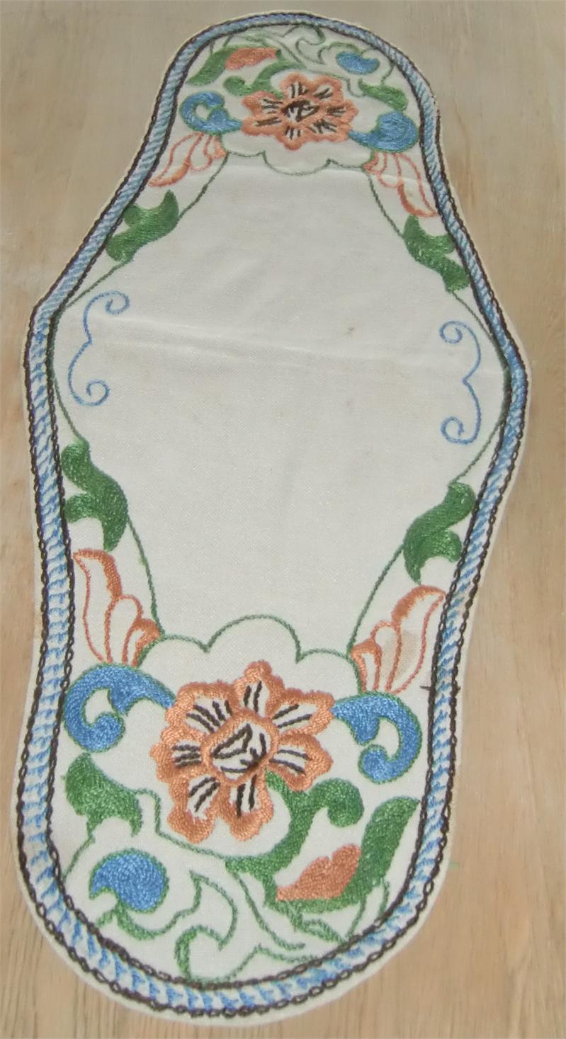 Three cloths embroidered in the same pattern on linen. The round tablecloth measures 0.70 meters in diameter.The longest oval tablecloth measures 1.00 meters long and 0.70 meters at its widest. The smallest oval tablecloth measures 0.80 meters long and 0.38 meters at its widest. They are in good condition and is still in use