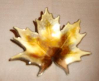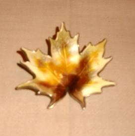 This beautiful vintage brooch is a classic maple leaf design by Hroar Prydz of Norway. Made of sterling silver with a gold vermeil wash, it is finished with vitreous glass (kiln-fired) enamel in warm, autumn shades of pale yellow, amber, and brown. The translucent enamel is applied over a detailed basse-taille pattern of veining, giving the piece a very realistic appearance. The piece also has the curvature of a fallen, drying autumn leaf.