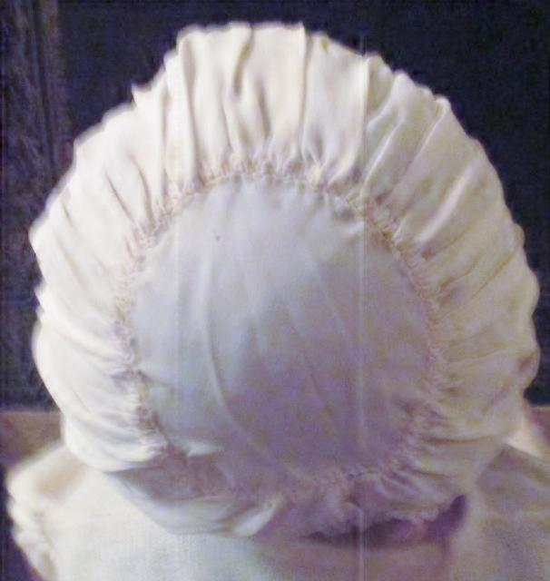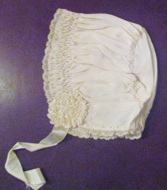 M951M Antique,Ivory Silk Baby Cap. Pretty antique baby bonnet. It is silk with lace trim. I do not know aging, but guessing it is late Victorian ca 1890. All bonnet comes from the same family and extends from the 1830s to the 1930s. This bonnet is in very good condition.