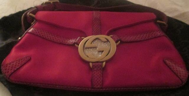 xxM977M Gucci Red Satin Evening Bag / Gucci Buckle, Rhinestones Snake Leather Trimming RED SATIN WITH RED SNAKE SKIN LEATHER AND RHINESTONES. THE FAMOUS GUCCI BUCKLE WITH RHINESTONES, WHICH ALSO SERVES AS THE CLASP FOR THE BAG, BY HAVING THE TOP FLAP SLIDE IN TO IT. OPENING AND CLOSING IS EASY AND SECURE. RED SNAKE LEATHER HANDLE AND TRIMMING ALL AROUND THE BAG. SAME RED SATIN LINING WITH DESIGNER LABEL ON THE OPEN SIDE POCKET. GORGEOUS AUTHENTIC/ORIGINAL GUCCI WITH THE ORIGINAL DUST BAG.