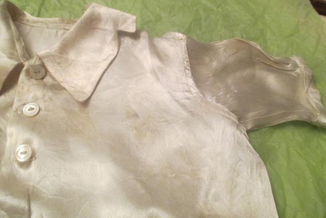1930s black and ivory satin toddler boy's overalls, in good condition. Two fabulous buckles of heavy stamped metal with Dutch boy and girl figures. The buckles are stamped "Rau F. Co. Of Prov R.I."