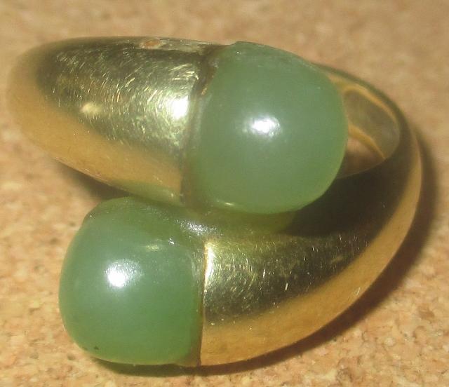 xxM1111M 14k gold and grossular stone ring. Beautiful, large and heavy 6,2 grams 585-14k gold and green grossular stone ring. It has a jeweler's stamp. It is a little unclear, but I think it is one of the renowned Norwegian goldsmiths. Grossular minral in the garnet group, which is formed by contact metamorphosis or unlean limestone, eg in Oslo fields. It can be colorless yellow, gren, brown, red etc. Takst Valuation N Kr 6500