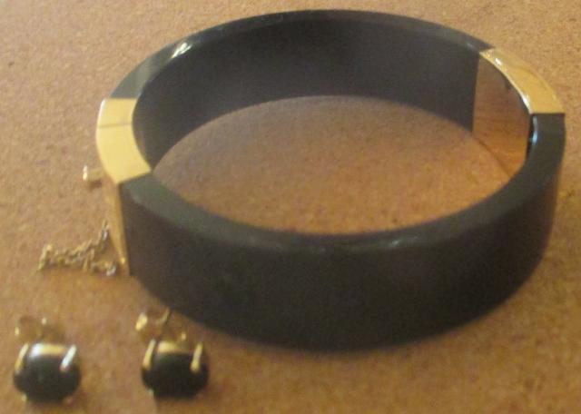 xxM1116M 14k gold and onyx jade bracelet and earrings. Vintage 14k Gold Black Onyx Jade BRACELET 1/4" tall and it is 2.5" in diameter. It weight 39, 3 grams.