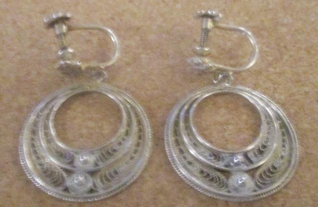 A pair of 830 silver handmade earrings with solid filigree work with screw. The ertrolig made before 1940s. They measure 3.5 cm x 2.5 cm. They are in excellent condition.
