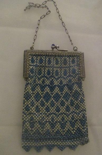 Antique ladies art deco metal mesh and enamel evening bag marked Mandalian Mfg.Co USA it measures about 16 by 10 cm and looks to be in excellent condition. The frame is quite fancy with two blue stones in the clasp, it still retains it's original I believe matching blue silk or satin lining and the silver frame has a nice even patina.