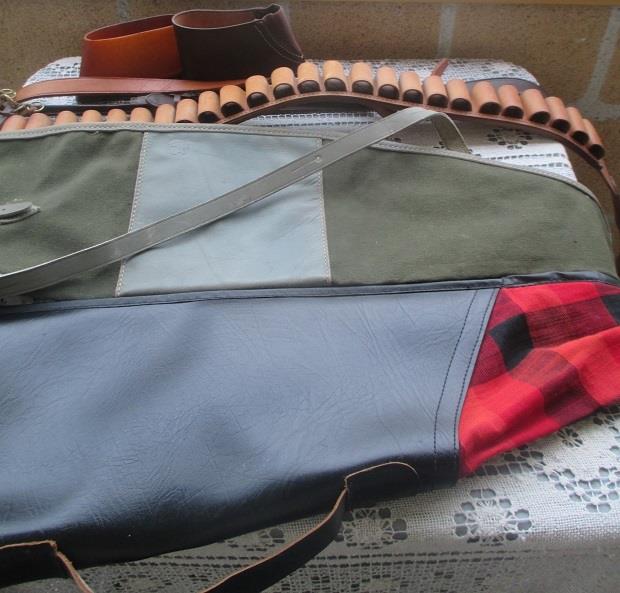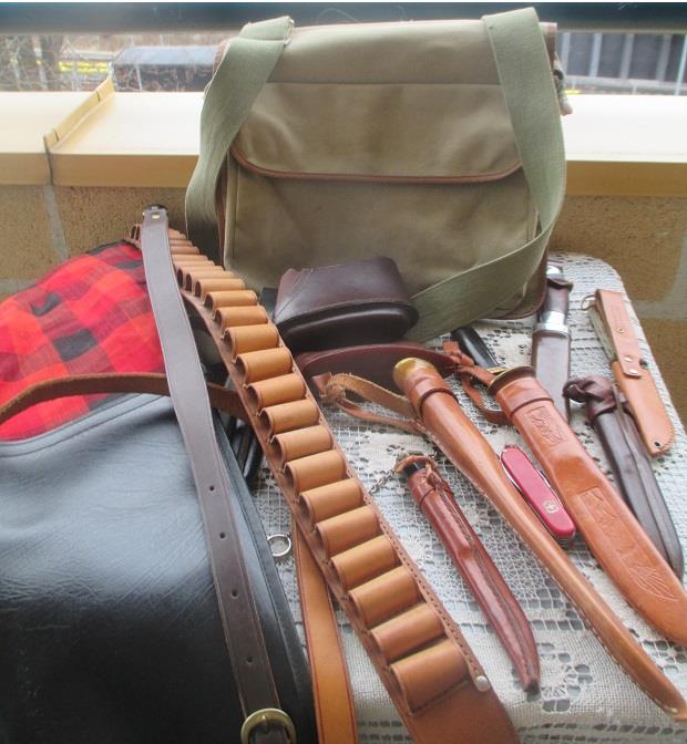 xxM1221M Sports Ba with exciting content. Sports Bag with an eciting content. Hence the three cartridgge belts, the gun cover. Rifle cover is stitched in canvas and leather. There with red fabric is not stamped. The green and gray are stamped Rondane Brede Vollstad. A well known norwegian designer. They are bought in Oslo in 1980-1990, On picture 3 seen four knives, 3 in leather case. From the left knife with horn handles in leather case. It is labeled M. Brusletto Geilo, made in Norway. The firm is known for its quality knives. Knife number two from the left is marked, but indistinch. Knife number three from the left in leather case, brand but indistinch. Knife four pink folding knife. On image four appear five sport knives. Number one from the left in leather case, horn handles and signed. Number two from the left, the knife is in leather case and have wooden handles. Signed with the same signature as number one. (I must have help in deciphering)Number three in leather case i find no signature. Under: number one from the left side knife with horn handles are unable to descipher the signature. Number two from the left. It is marked Puma Germany. Sportsveske med et spennende innhold. Derav tre patronbelter, to geværcover. Geværcoverene er sydd i lærret og skinn. Det med rødt stoff er ikke stemplet. det grønne og grå er stemplet Rondane Brede Vollestad.En kjent designer. De kan stamme fra 1980-90 tallet. På bilde nummer tre, fire sportskniver, tre har læretui. fra venstre kniv med benskaft i læretui. Kniven er merket M. Brusletto Geilo, made in Norway. firmaet er kjent for sine kvalitetskniver. Kniven ved siden av er uten etui, merket men utydelig. Kniv nummer 3 fra venastre i læretui merket, men utydelig. Kniv 4 rosa foldekniv. På bilde fire vises fem sportskniver. Nummer en fra venstre i læretui, benskaft og signert. Nummer to fra venstre, kniven er i læretui og har treskaft. Signert med samme signatursom nummer en. (Jeg må ha hjelp til tydingen). Nummer tre i etui finner ingen signatur. Nummer en fra venstre nede, kniv i etui med benskaft klarer ikke å tyde signatur, Nummer to fra venstre nedre rekke. Den er merket Puma Germany.
