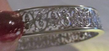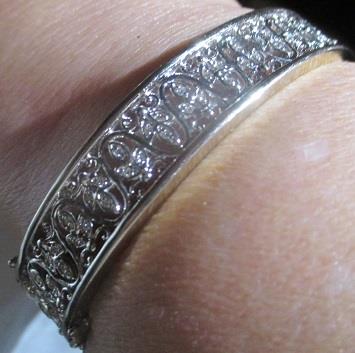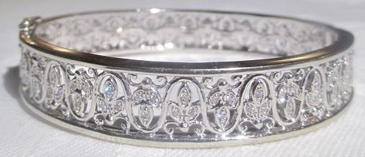Diamond Bangle Bracelet 14k white gold Filigree. Gorgeous bracelet is a real showtopper. 1/2carat in diamond and 14k plumb white gold. It is 11,5 mm wide with a lovely filigree design. It is Sl l-SI ll and color is approimately G-H weigh 34 grams. Takst-Valuation N. Kr. 37 000