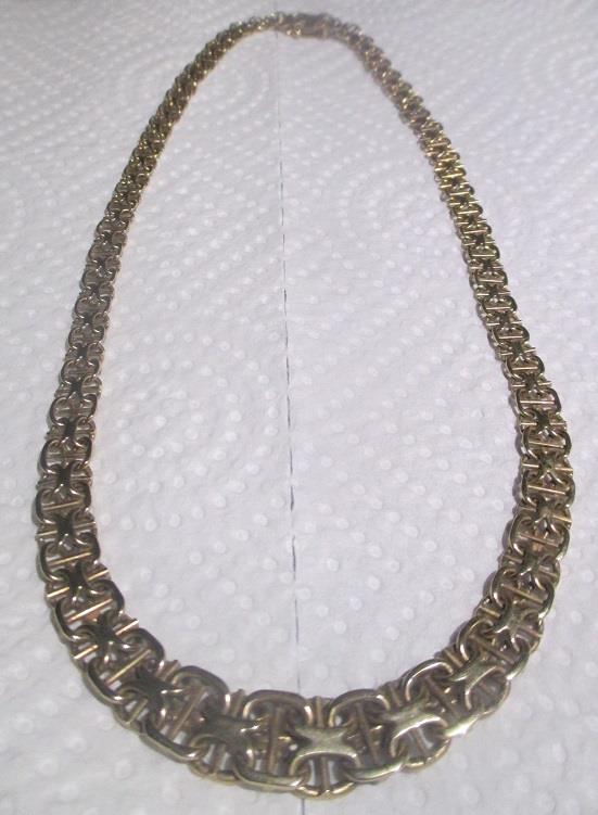 A 14K yellow gold collier X med stav (x with a stick) It is 42 cm long and weight 24,7 grams. In excellent condition. Takst-valuation N. Kr. 20 000