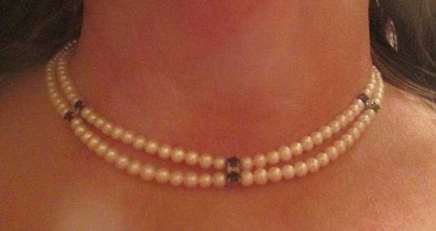 Two-row freshwater pearls necklace 43 cm with 14k yellow gold lock. The pearl necklace has about 200 small pearls. The pearl necklace has three 14k yellow gold intermediates with six sapphires and six 8/8 diamonds calculated weight 0,03ct. The necklace weighs about 24 grams. A beautiful neklace in excellent condition. Takst-valuation N.Kr. 8000