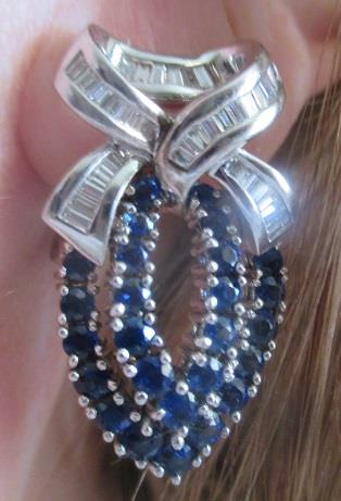 Stunning 18k white gold large drop earrings with blue sapphire and diamonds. There are 26 round cut sapphire and about 1 ctw baguette - cut diamond in each earringss. Diamond colur J-K- clarity SI 1 -Sl 2. 18k gold hallmark. Total weigh 21,2 grams. One of a kind earrings. Takst-Valuation N. Kr. 50 000