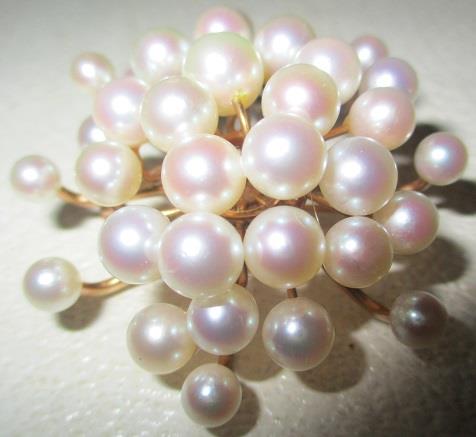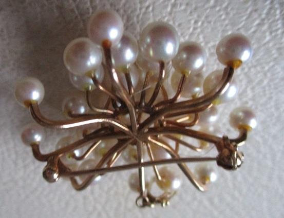 A yellow gold brooch/pendant weight 15,0 grams with 33 cultured pearls 4,5 - 7,00 mm. It is 5 cm high and 4,5 cm wide. The brooch is not marked, but test 14k gold. It is probably made in the early 1900s It is handmade. fredrik Georg Gade who is the appraiser for the goldsmiths and auctions in Oslo has appreaciated this brooch/pendant for kr. 20 000 (see picture)