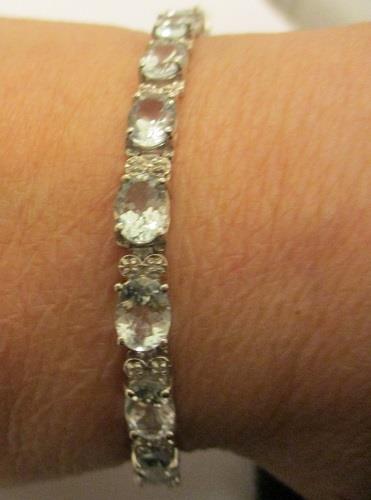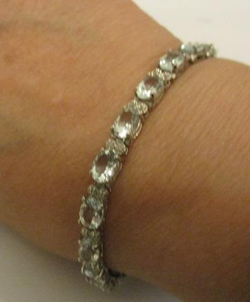 Aquamarine and diamond tenis bracelet, 14k white gold. There are 19 aquamarine and 38 round faced 8/8 diamond, calculated weigh 0,15ct. The bracelet measures about 20 cm lomg and weighs 13 grams.Takst-Valuation N.Kr. 22 000