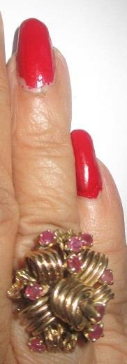 A yellow gold cocktail ring stamped 14k, with 10 rubies 2,5-3mm. Total weight 11 grams. Takst-valuation N. Kr.11 000