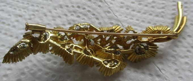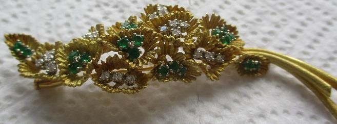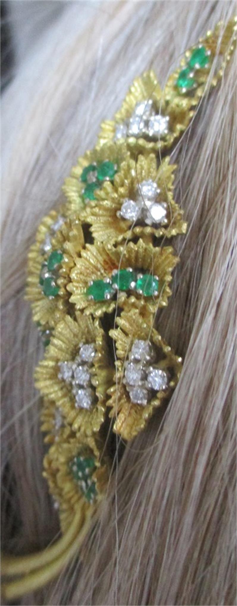 18k gold emarald and diamond brooch hair decoration. Beautiful vintage 18k gold floral brooch set with emeralds and diamonds. The 21 brilliant cut diamonds are bright and have good colour and clarity. Diamonds weight 0,63-0.84 ct. 20 emeralds about 2mm. The brooh/hair deoration measures 3 cm aross by 8,5 cm tall. It weighs 27,6 grams. takst-valuation N. kr. 42 000
