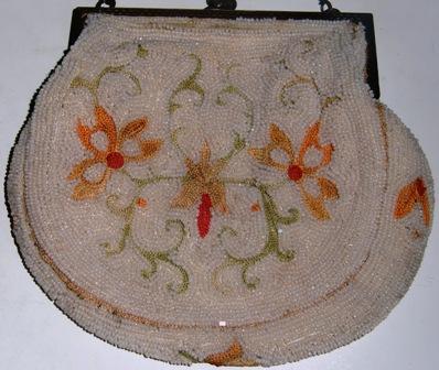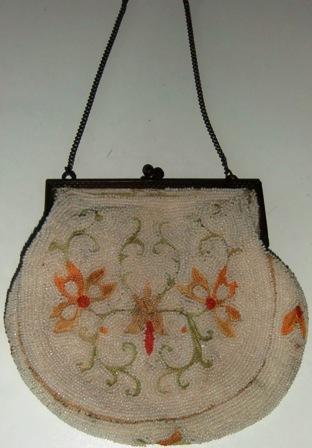 M58M French Tambour Embroidery Handbag. It is made in France 1920-30 with white beads surrounding bow and floral embroidery. metal frame and chain. In mint condition. L