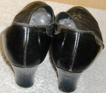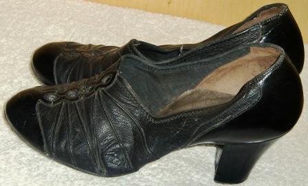 Black leather vintage shoes. These have a stamp on the inside with numbers but there is no maker and i cannot make out a size. 9.75" interior heel to toe, 2.75" exterior ball of foot with a 3" heel. Vented over the top of the vamp. Cute style and a functional shoes but these have seen signs of heavy wear and were stored crumpled in a box.