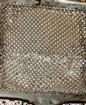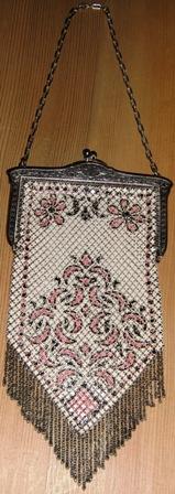 THIS GORGEOUS HAND PAINTED ENAMELED MESH PURSE. MADE BY MANDALIAN MFG.CO. DURING THE DEPRESSION ERA. THE CREAMY BACKGROUND IS COMPLIMENTED BY A PINK AND BLACK ART DECO DESIGN. A TRUE BEAUTY. THE PURSE MEASURES APPROXIMATELY 7.5" FROM CLASP TO BOTTOM FRINGE. THERE ARE NO SEPARATIONS OR DAMAGE TO THE MESH. THE FRAME IS A SILVER TONE WITH MANDALIAN MFG.CO. STAMPED ON THE INSIDE. THE CLASP OPENS AND CLOSED WITH A SNAP.THE FRAME IS ALSO GOLD TONE WITH A SOFT SCROLLING DESIGN. L This eyecatching and collectable item bears the name of one of the most renowned makers of mesh bags - the Mandalian Manufacturing Company. The company was founded by Sahatiel Gabrabed Mandalian, who was born in Turkey in 1869, and who emigrated to the United States of America in 1889. After settling and marrying in North Attleboro, Massachusetts, Mandalian formed a business partnership, and the company (called Casper and Mandalian after its owners) initially made jewellery. Following a change of partner and name (to Mandalian & Hawkins) in 1906, the company began to specialise in the manufacture of mesh bags. By 1915, Mandalian & Hawkins was one of the most important mesh bag producers in America; it was in this year that Mandalian purchased his partner's share of the company, which then became known as the Mandalian Manufacturing Company. The company took pride in adopting innovative design and production techniques for its mesh bags, with the aim of delivering high quality items. Its bags tended to be decorated with ornate and colourful floral motifs, or alternatively, patterns reminiscent of those seen on Turkish carpets (inspired by the owner's heritage). Mandalian produced mesh bags only for a relatively short period, and the company was sold to the leading American mesh bag maker - Whiting & Davis - in 1944. Its founder died five years later