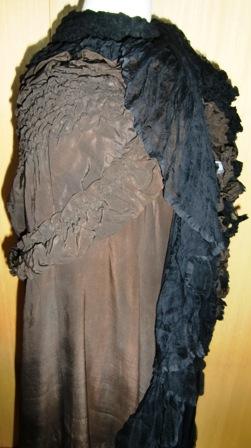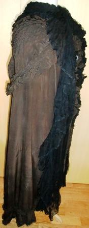 Overall condition is good. The silk is in good condition except for a 2" mend at the right breast. There seems to be a bit of ribbon detailing/trim on the right side of the hood (if you're looking at the cape from the back) that is missing.