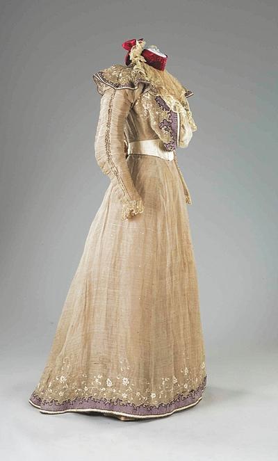 xxA rare Maison Worth summer gown, 1897, labelled and numbered 91416, with blue art-nouveau stamp to the ivory petersham waistband, the bodice and skirt of ecru silk organza spangled with gold sequins, edged with lilac felt and embroidered in white cotton with delicate trailing blooms, the bodice back fastened with flounced shoulders, ivory satin waistband and collar (later added crimson velvet neck-band), the front of the bodice with curved pouch inset with chiffon and lace jabot, tightly ruched and gathered sleeves, integral underskirt of beige taffeta, bust 81cm, 32in, waist 56cm, 22in (2) This gown was designed by Jean-Phillipe Worth who took over as designer for the house upon his father's death in 1895. The blue stamp is found on only the Summer and Winter 1897 collections. It was not used for the demi-collections. Provenance: From the collection of the late Mary Wild A.R.C.A, costume designer, historian and collector. I bought the gown this year, so now it is in Norway. House of Worth dominated the Parissian fashions in the end of the 19th beginning of 20th century. Read my article Houte Couture 1870 - 1920.