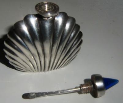 M544M STERLING SILVER PERFUME BOTTLE POST 1940. A petite 925 Sterling silver and cobolt glass perfume Vial. Mexican Sterling Silver. Eagle with No 21 (Ormex) Patented 7645. Height 1 1/2, Width 2, Depth 3/8. A wonderful little bottle in excellent condition.