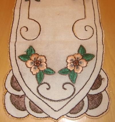 Vintage oval runner. This fabric is old. It has embroidered roses. One of the roses are embroidered in a different color. I have been told by the son of the lady who embroidered cloth that were embroidered in World War II. She did not have enough yarn and failed to get yarn in the same color. Therefore, one of the roses embroidery embroidered in a different color