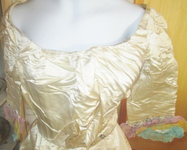 xxM1010M Late Victorian wedding gown Nice Here is a wonderful example of a late Victorian gown made of a luxurious peau de soie thick silk. The bodice is lined in linen and heavily boned. The sleeves are decorated with gaily colored chiffon. The huge skirt is magnificent; such a full sweep. In very good condition for its age with little damage to the silk; there are a few marks here and there (please see detail photos). The skirt is lined in a tissue silk that is disintegrating. Such a beautiful ensemble, it was likely a wedding gown. The label reads: "Madame Galbraith, Salt Lake City, Utah." Measurements: Bodice: Bust: 32 Waist: 20" Length (top of shoulder to waist): 13" Sleeve length (under arm to cuff): 10" Skirt waist: 22" Skirt length in the front: 39" Skirt length in the back: 48" PRice 1200USD