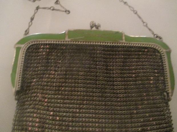 Vintage Art Deco Whiting & Davis Green Pink Cloisonne Enamel Mesh FLAPPER Purse. Vintage Art Deco era baby fine mesh purse signed on the inside of the frame Whiting & Davis. Beautiful deco geometric design in pink and green outlined in silver. Van Dyke fringe. Still retains the original cloisonne enamel frame. Measures17 by 13 cm. . In excellent condition for age. Hinges nice and tight against the frame. Both sides just under the frame hinge could use a couple invisible stitches.