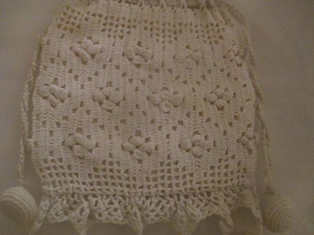 Beautiful ivory Crochet drawstring wedding bag - Fit for a bride~ evenly darkened with age to an ivory in original condition no damage, silk lined~ Measures 5" x 6" inches plus trim - Lovely keepsake for a bride!