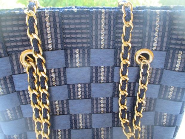 Elegant woven straw handbag, navy with gold flecks. Double straps made of thick gold chain, woven with blue braid. Bag is lined with 1 zip pocket, closes at top with zipper. Has Pollini logo zippers. Quality bag.