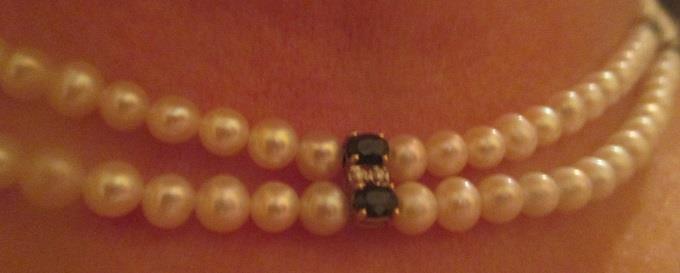 Two-row freshwater pearls necklace 43 cm with 14k yellow gold lock. The pearl necklace has about 200 small pearls. The pearl necklace has three 14k yellow gold intermediates with six sapphires and six 8/8 diamonds calculated weight 0,03ct. The necklace weighs about 24 grams. A beautiful neklace in excellent condition. Takst-valuation N.Kr. 8000