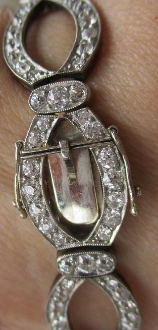 This beautiful bracelet is made in the early 1900s. It can be somewhat older. Its not stamped,it was normal at that time. However it is 14k+ tested. The bracelet consists og 153 old cut diamonds. Calculated total diamond weight 7,50ct. the bracelet weighs 20,45 grams.The bracelet is in very good condition.Takst-Valuation N.kr. 125 000