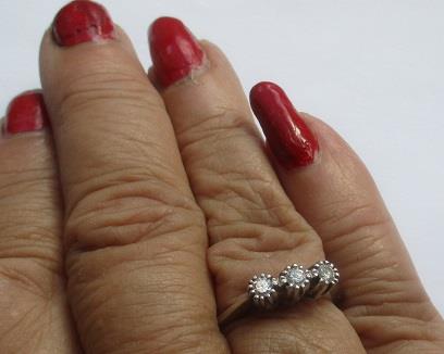 14 k 585 marked white gold 3- stone diamond ring. Three brilliant ut diamond total weigh 0,23ct. Takst-Valuation N. kr .12 000