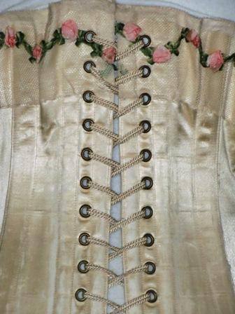 xxA wonderful corset from 1910. It is in shiny white silk and is decorated with tulle and silk flowers. Which leads me to believe that there may have been a wedding corset. There are traces of a trade mark but it is now so obscure that I can not read it. This is a beautiful corset, high class in excellent condition.