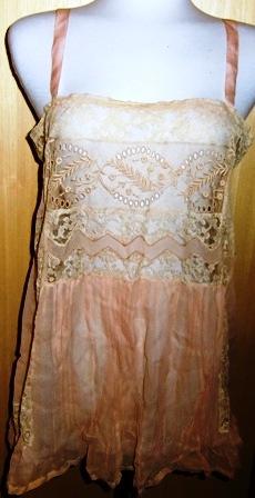 M171MGreat underwear from fifth Avenue. This is a fabulous lingerie set consisting of shirt and panties. This type of underwear came on the market in 1908. This set was made for a wedding in 1917. It is made in shiffong and lace and silk flower arrangements. The label read: Franklin Simon & co Fifth Ave. New York. It is in very good condition.