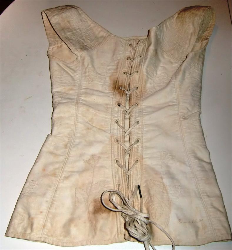 XXThis is a bridal corset from 1820. It is in white silk lined with white cotton. It has white stitching embroidery. It has had the corset shrub, but it has now gone. The corset has several age spots which degrade the corsets conditioning. I hope someone can help me with the spots. It will then be in good condition.