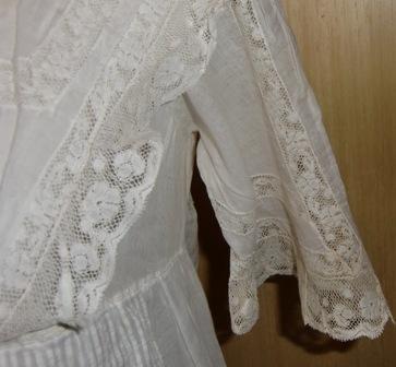Much beauty of the piece. Exquisite white cotton batiste dressing gown with lace insets and embroidery.