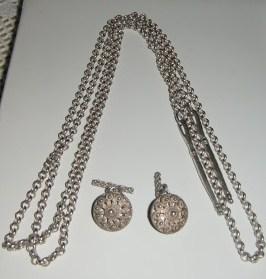 Cufflinks 925S and long chain in pewter. Cufflinks are used to the shirt on the costume. The link in the pewter is used to lace together bunad. Vintage clothing museum 1940-1970-designers showing at number M379M Sunnfjord bunad. Where seen the long chain in pewter in use. Both cuff links and pewter link is in excellent condition