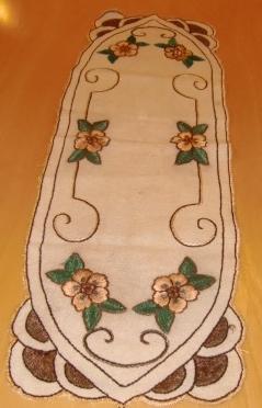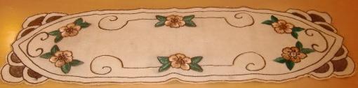 Vintage oval runner. This fabric is old. It has embroidered roses. One of the roses are embroidered in a different color. I have been told by the son of the lady who embroidered cloth that were embroidered in World War II. She did not have enough yarn and failed to get yarn in the same color. Therefore, one of the roses embroidery embroidered in a different color