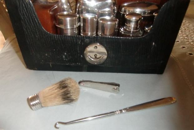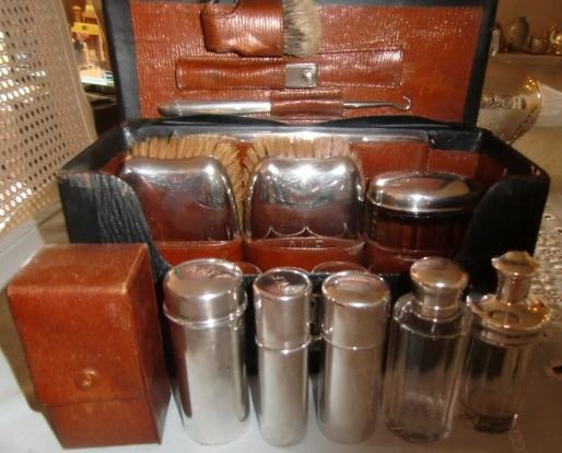 M809M Titanic area 1912 Silver 925 Gentleman vanity case. gentleman vanity box from Tatanic period 1912. The box is in leather and carrying small signs of wear, as may be seen photographers. All content is stamped 925 sterling silver and made of Gorham USA. The box contains 1 Baber cost with beaver hair. 2 Button hook. 3 neil cut and file. 4 silver case for the comb. 5 Two large brushes. 6 Leather case for Baber planer. 7 Soap case. 8 Soap case. 9 Case for pudder.10. Two bottles of aftershave. 11 A large cream carton. All in very good condition.