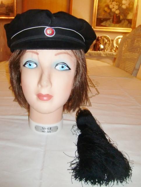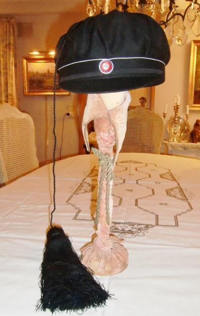 xxM878M Norwegian student cap. The Norwegian student cap has traditionally been a black cap with a tassel hanging in a long string Lua has short stiff screen and folded flat and round attached to a head ring, that is shaped like a variation of the widespread the cap from 1800 - century. The front is a red-white-blue rosette with a Minerva head. Student cap be solely borne by the student passed the exam, graduated from high school, graduation from the old school and student enrollment at a university. Cap was originally conceived as part of a student uniform. Hans H. Holm A / S Karl Johans gate 23 had a patent on student hat. The student cap is no longer in production. TB