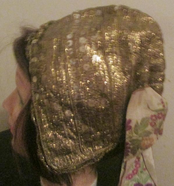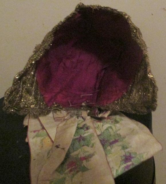 Extraordinary and extremely RARE bonnet dating of the end 1790/1800, German origin, allover covered with gold metallic trim and ornated with rows of stitched on sequins! The bonnet is totally red silk lined and has a bright colourful all silk embroidered ribbon at its back. The condition of the bonnet is surprisingly perfect, only the silk ribbon has somehow suffered over the ages The measure from one side to the other 16" (40cm)