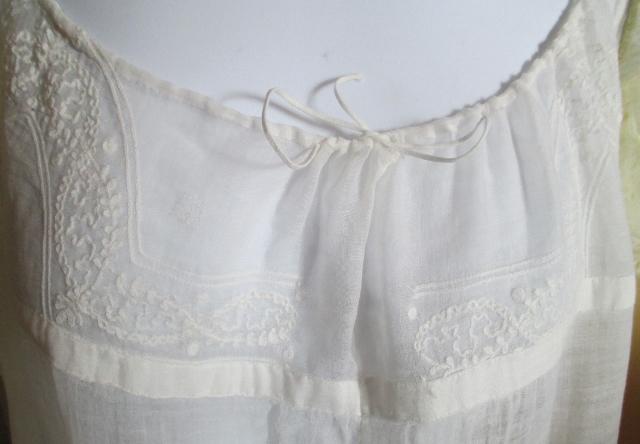With Train. The dress is thin muslin with lovely white stitching embroidery. Early in 1800, cotton is the news that was only reserved for the upper class. Musilin referred to a varity og white cloth woven from very finr spon Cotton yarns. The resulting cloth was transparent and gause-like.The gown is in very good condition.