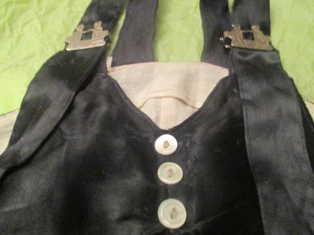 1930s black and ivory satin toddler boy's overalls, in good condition. Two fabulous buckles of heavy stamped metal with Dutch boy and girl figures. The buckles are stamped "Rau F. Co. Of Prov R.I."
