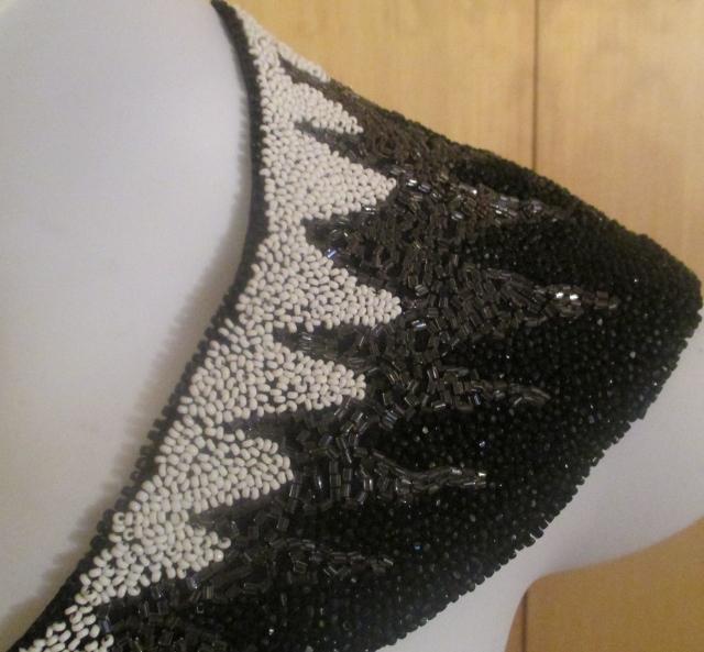 xxM1017M Art deco collar beaded. This beautiful pearl embroidered collar came along with a 1920s dress. It is assumed to be made in 1920-30. It is handmade and has a typical art deco pattern. Lined with black silk. No loose beads in excellent condition.