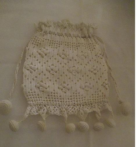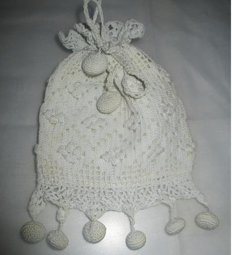 xxM1139M Victorian wedding purse. Antique Victorian crochet bridal wedding drawsting purse bag. Beautifuk ivory crochet drawsting wedding bag - fit for a bride, silk linned. Measures 12 x 16 cm pluss trim-Lovely keepsake for a bride.