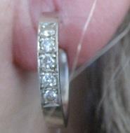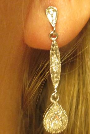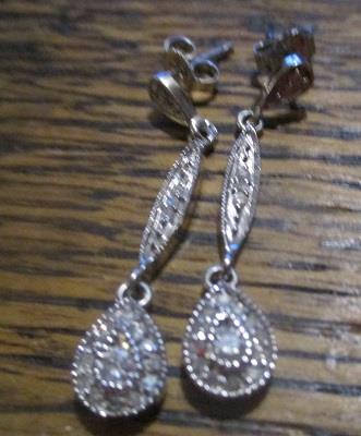 This is a pair of dangle earring, that weight 2,9 grams. Each earring has 17 round diamonds. There are 1 in the top, 3 in the middle, and 13 in bottom. Total it is: 2 brilliants 0,10 ct, 8 brilliants 0,08ct, 24 8/8 diamond 0,10ct. These earrings are 3 cm long. They are in excellent condition. Takst -Valuation N.Kr. 12 000.