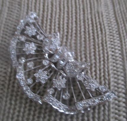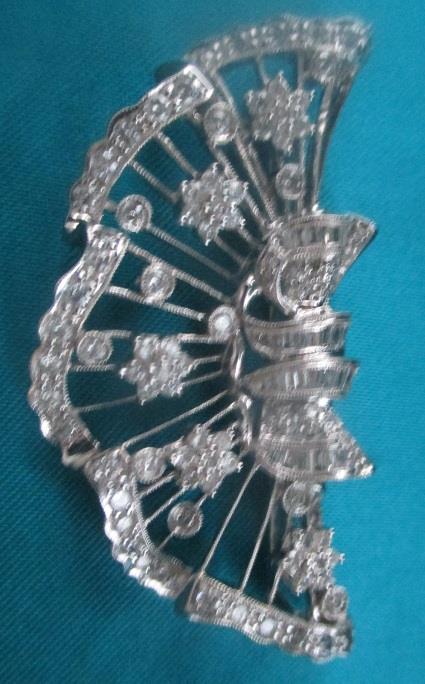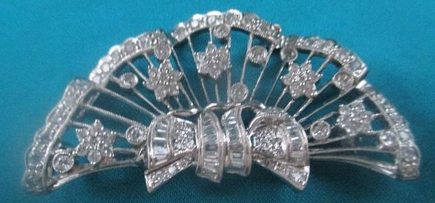xxM1243M White gold 2,6 ct Diamond Brooch. This is a beautifully crafted piece featuring 2,6 ct of diamonds displayed in 14k white gold. The brooch has 97 brillants diamond calculated weight 2,3 ct. 29 baguette diamonds calculated weight 0,3ct. Diamond colur H (Wesselton), Clarity SI 1, Cut excellent Measures are: 5,5 cm wide and 2,5 cm high, weights 14,8 grams. Takst- Valuation N.Kr 45 000