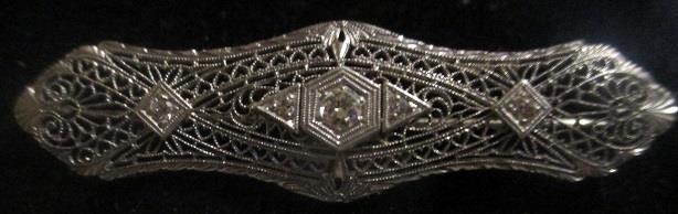 White gold and diamond Art deco filigree brooch. A white gold brooch 4,7 grams. One old-cut diamond weight 0, 13 ct. Two old-cut diamond weight 0,08 ct. Two 8/8 diamond weight 0,04 ct. Takst-Valuation N.Kr 25 000