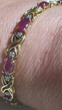 Ladies 14K yellow gold ruby and diamond bracelet. the bracelet features 11 oval rubie and 22 8/8 diamond, calculated weight 0,11 ct. The bracelet is 19 cm long and weighs 10,9 grams. Takst-Valuation N. Kr. 20 000